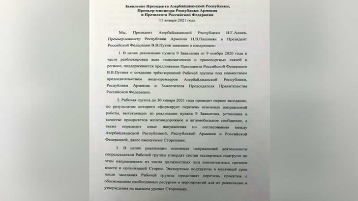 Biz, Azərbaycan Respublikasının Prezidenti İ.H.Əliyev, Ermənistan Respublikasının Baş naziri N.V.Paşinyan və Rusiya Federasiyasının Prezidenti V.V.Putin aşağıdakıları bəyan edirik: