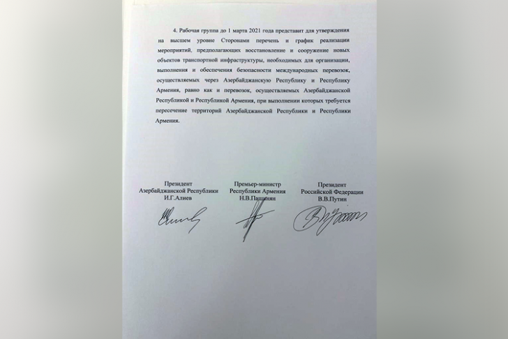 1. 2020-ci il 9 noyabr tarixli Bəyanatın 9-cu bəndinin regionda bütün iqtisadi və nəqliyyat əlaqələrinin bərpası ilə bağlı hissəsinin reallaşdırılması məqsədilə Rusiya Federasiyasının Prezidenti V.V.Putinin Azərbaycan Respublikasının, Ermənistan Respublikasının baş nazirləri müavinlərinin və Rusiya Federasiyası Hökumətinin sədr müavininin birgə həmsədrliyi ilə üçtərəfli İşçi qrupu yaradılması barədə təklifi dəstəklənir.