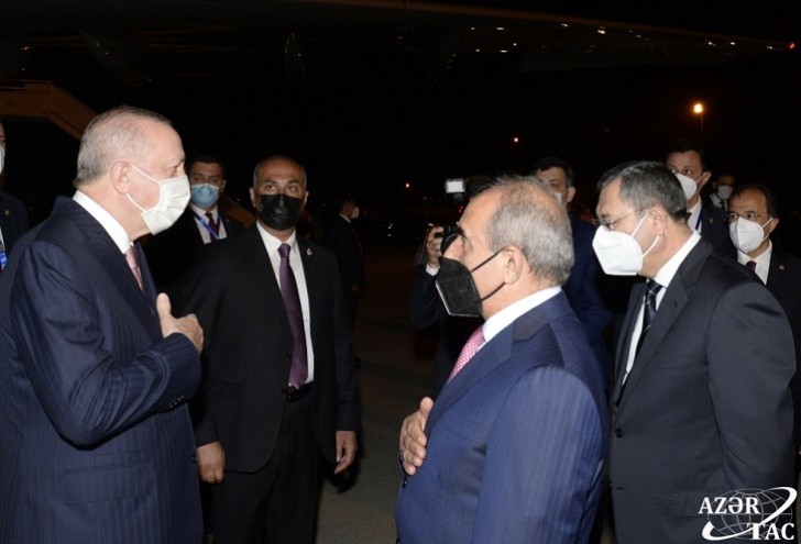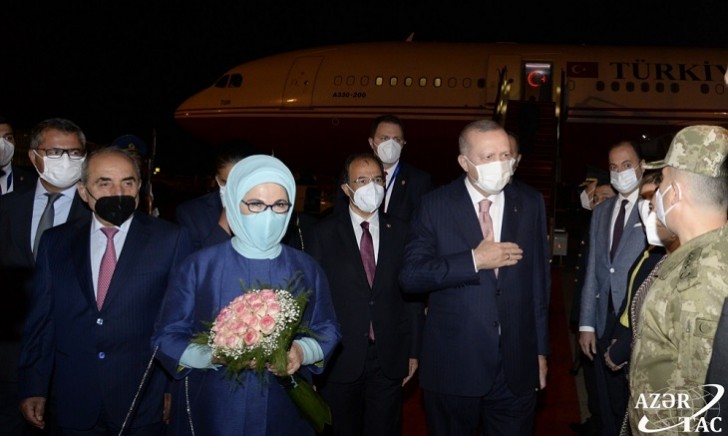 Türkiyə Prezidenti Rəcəb Tayyib Ərdoğanı və xanımı Əminə Ərdoğanı hava limanında Azərbaycan Baş nazirinin birinci müavini Yaqub Eyyubov, xarici işlər nazirinin müavini Xələf Xələfov və digər rəsmi şəxslər qarşılayıblar.