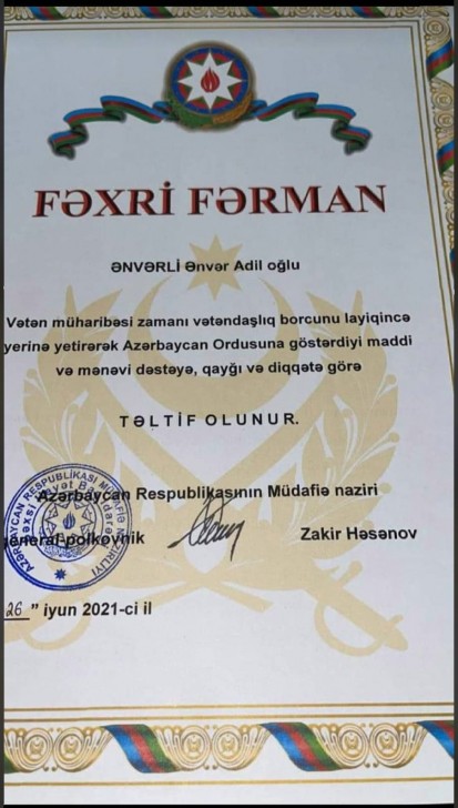 Müdafiə naziri Zakir Həsənov icra başçısının oğlunu Fəxri Fərmanla təltif edib.