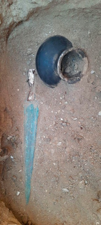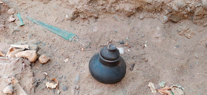 İlkin tədqiqatlar zamanı dəfn kamerasında Son Tunc və İlk Dəmir dövründə mövcud olmuş Xocalı-Gədəbəy arxeoloji mədəniyyəti üçün xarakterik olan qara cilalı, üzəri naxışlı bir neçə küp, tuncdan qılınc, dəvə gözü daşından (obsidian) və çaxmaq daşından ox ucluqları, ülgüclər, tuncdan hazırlanmış geyim aksessuarları tapılıb.