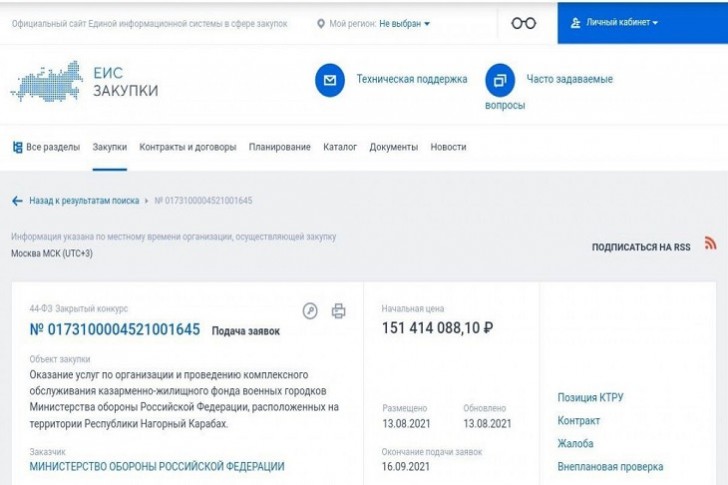 “Qafqazinfo” xəbər verir ki, dövlət portalında yer alan məlumata əsasən, Azərbaycan ərazisində müvəqqəti olaraq yerləşdirilmiş Rusiya sülhməramlı kontingentinin hərbi şəhərciyində xidmət barədə tender elan olunub.