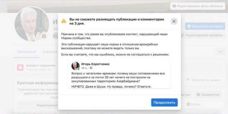 Feysbuk Korotçenkonu “Niyə ermənilər 30 ilə yaxın müddətdə Azərbaycanın işğal olunmuş ərazilərində hər şeyi dağıdıblar, heç nə tikməyiblər?” sualına görə üç günlük bloklayıb.