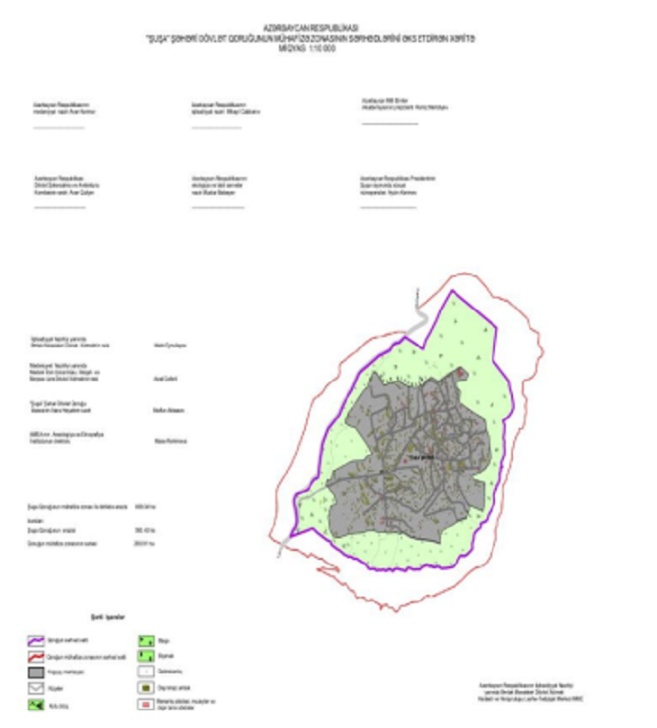 “Azərbaycanın mədəniyyət paytaxtı – Şuşa şəhəri haqqında” Azərbaycan Respublikası Qanununun 2.2-ci maddəsinə əsasən Şuşa şəhərinin inzibati sərhədlərinə bitişik yerləşən və onunla təbii-landşaft, sosial, tarixi, mədəni və ya təsərrüfat bağlılığı olan və ya Şuşa Şəhəri Dövlət Qoruğunun mühafizəsi, qorunması və ya inkişafı üçün əhəmiyyətə malik olan ərazilərdə mühafizə zonasının sərhədlərinin müəyyən edilməsi nəzərdə tutulub.