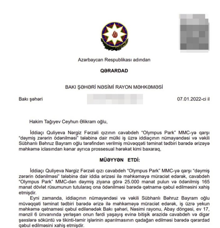 AFN.az “Qafqazinfo”ya istinadən xəbər verir ki, bununla bağlı yanvarın 7-də Nəsimi rayon məhkəməsi qərardad çıxarıb. İş üzrə yekun məhkəmə aktı qəbul edilənədək, Bakı şəhəri, Nəsimi rayonu, Abay döngəsi, ev 17, mənzil 6 ünvanında yerləşən iddiaçı Quliyeva Nərgiz Fərzəli qızının fərdi yaşayış evinə bitişik ərazidə tikinti-təmir və söküntü işlərinin aparılması cavabdeh “Olympus Park” MMC-yə və digər şəxslərə qadağan edilib.