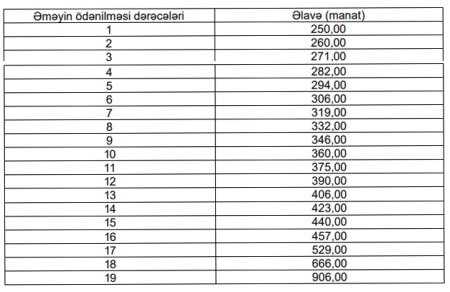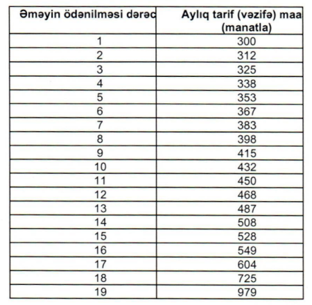 Bundan başqa, səhiyyə işçilərinin aylıq vəzifə maaşları "Səhiyyə sahəsinə aid olan qulluqçu vəzifələrinin və fəhlə peşələrinin Vahid Tarif-iİtisas Sorğu Kitabçası” əsasında 19 dərəcə üzrə müəyyən ediləcək. Əvvəl dərəcə sayı 18 idi. 19-cu dərəcə üzrə aylıq vəzifə maaşı 979 manat olacaq: