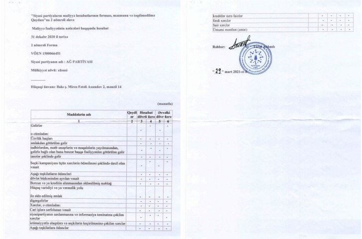 Məsələ ilə bağlı AĞ Partiyanın sədri Tural Abbaslı saytımıza açıqlamasında bildirib ki, bu, Mərkəzi Seçki Komissiyasına verilən hesabatdır: