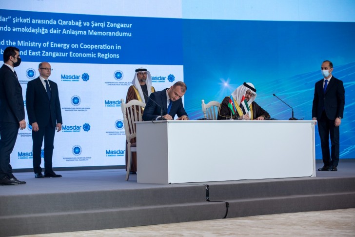 Nazirliklə şirkət arasında “Qarabağ və Şərqi Zəngəzur iqtisadi rayonlarında bərpa olunan və təmiz enerji sahəsində əməkdaşlığa dair” Anlaşma Memorandumunu Energetika Nazirliyi yanında Bərpa Olunan Enerji Mənbələri Dövlət Agentliyinin direktoru Təbriz Əmmayev və “Masdar” şirkətinin baş icraçı direktoru Mohamed Jameel Al Ramahi imzalayıblar. Memorandum Azərbaycanın işğaldan azad edilmiş ərazilərində bərpa olunan enerji mənbələrinin tətbiqi sahəsində potensial əməkdaşlıq imkanlarını müəyyən edir. Sənədə əsasən, “Masdar” şirkəti sənaye həcmli külək və günəş elektrik stansiyaları, damüstü günəş elektrik sistemləri və s. kimi istiqamətlərdə investisiya imkanlarını Nazirliklə koordinasiyalı şəkildə araşdırmaq niyyətindədir.