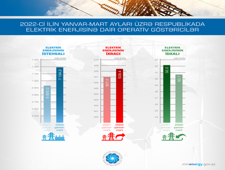 2022-ci ilin ilk 3 ayı üzrə elektrik enerjisinin ixracı 508,4 mln. kVt•st olmaqla, 2021-ci ilin eyni dövrü ilə müqayisədə 1,4 mln. kVt•st artıb. Bu dövrdə elektrik enerjisinin idxalı isə 30,7 mln. kVt•st olmaqla, ötən ilin müvafiq dövrünə nisbətən 1,5 mln. kVt•st azalıb.