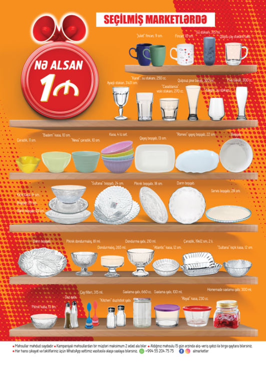 Ailənizin ehtiyacları üçün 20 May-10 İyun tarixlərində Al Marketlərə gəlin, siz də qazanın. Kampaniya günlərində süfrənizi bəzəyəcək dekorativ qablar,qonaqlarınızı zövqlə qarşılayacağınız boşqab, fincan və kasalar, su və çay stəkanlar, mətbəxinizdə rahatlıq yaradacaq elektrik əşyaları, saxlama qabları, plastik qablar, uşaqlar üçün oyuncaq və məktəb ləvazimatlarını 1,2,3,4 manatdan başlayan qiymətlərlə əldə edə bilərsiniz.