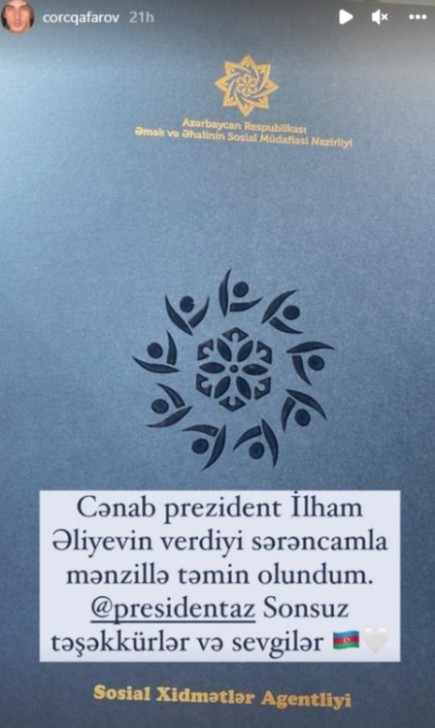 "Cənab Prezident İlham Əliyevin verdiyi sərəncamla mənzillə təmin olundum. Buna görə dövlət başçımıza sonsuz təşəkkürümü bildirirəm" deyə, Corc paylaşımına yazıb.