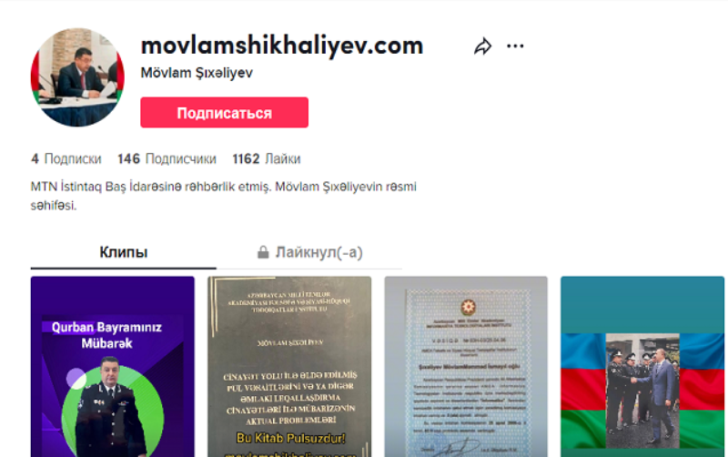 “Tik-Tok”da açılmış profildə Mövlam Şıxəliyevə aid foto və videolar, həmçinin sənədlər paylaşılıb.