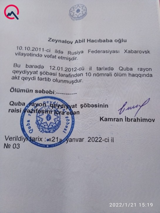 A. Zeynalov üçün ölüm kağızına imza atan Quba rayon qeydiyyat şöbəsinin rəisi Kamran İbrahimov da məsələyə münasibət bildirdi. Onun sözlərinə görə, ölüm kağızı məhkəmənin qətnaməsinə əsasən hazırlanıb: “Zeynalov Abil Hacıbaba oğlu barəsində 10 oktyabr 2011-ci ildə Rusiya Federasiyasında vəfat etməsinə dair 2012-ci ildə məhkəmə qətnaməsinə əsasən ölüm faktı müəyyən olunub. Həmin illərdə biz orada işləməmişik və bu barədə məlumat da yoxdur. Lakin biz sənədlərin kökünə baxarkən müəyyən edirik ki, qanunvericilikdə də hüquqi faktların müəyyən olunması var. Yəni məhkəməyə müraciət edərək ölüm faktını müəyyən etdiriblər və buna əsasən qeydiyyat şöbəsinə müraciət ediblər. Bundan sonra ölüm haqqında sənəd açıblar. Ölüm qeydiyyatı hazırda da mövcuddur, ləğv olunmayıb. Bununla bağlı gərək vətəndaş məhkəməyə müraciət etsin. Bundan başqa o, səfirliyimizə və konsulluğumuza da müraciət edə bilər. Etibarnamə göndərməklə də məhkəmədə o qətnaməni ləğv elətdirə bilər. Yəni qanunvericilikdə bu nəzərdə tutulub ki, itmiş, ölüm faktı çıxmış şəxs varsa, həmin adam gələrsə, qeyd olunan məhkəmə qətnaməsi ləğv olunmalıdır”.