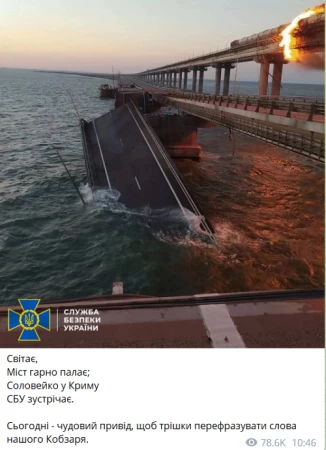 Ukrayna Təhlükəsizlik Xidməti (SBU) bu partlayışla bağlı heç bir rəsmi şərh verməyib. Ancaq SBU-nun rəsmi teleqram -kanalında baş vermiş hadisə ilə bir foto yerləşdirilib.