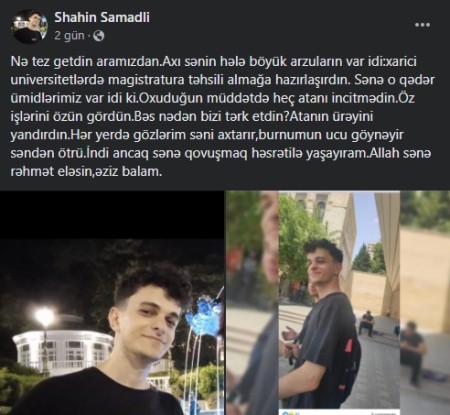 Bir neçə gün əvvəl Bakıda kirayə yaşadığı mənzildə intihar edən Azərbaycan Dövlət İqtisad Universitetinin (UNEC) tələbəsi, 2003-cü il təvəllüdlü Şəhriyar Səmədlinin atası Şahin Səmədli oğlunun vəfatı ilə bağlı paylaşım edib.