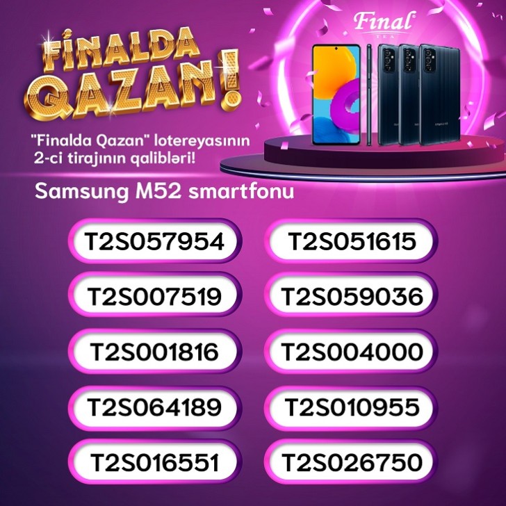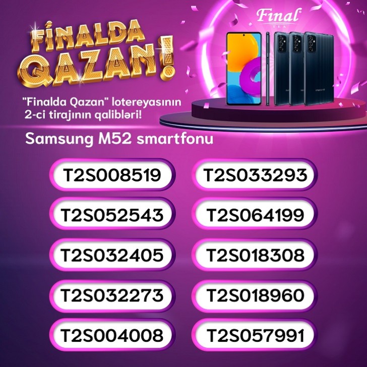 Qeyd edək ki, lotereya müddətində istehlakçılar 450 qramlıq “Final” “Super”, “Best blend”, “Ultra Earl Grey”, “Melody”, “Pekoe”, "Earl Grey çay çeşidləri aldıqda Volkswagen Polo, 225 qramlıqlarda isə Samsung M52 smartfonu qazanmaq şansı əldə edə bilərlər. Lotereyadan qeydiyyatdan keçmək isə çox asandır. Belə ki, alınan uduşlu “Final” çay çeşidlərinin qapaqlarının altından çıxan kodu “Azercell” və “Bakcell” mobil operatorlarından, ödənişsiz olaraq, 6625 nömrəsinə göndərməklə hər bir şəxs iştirakçı ola bilər. Həmçinin lotereyada iştirak edək 450 qramlıq çaylardan alan hər kəs 5 dəqiqə, 225 qramlıq alan 3 dəqiqə şəbəkədaxili pulsuz danışıq vaxtı qazanacaq.