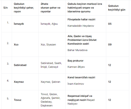 Yanvarda nazirlər bu rayonlarda vətəndaşları qəbul edəcək – CƏDVƏL