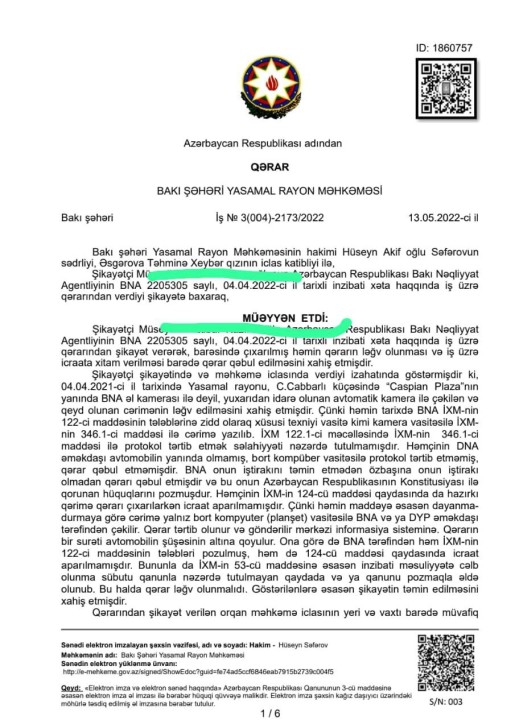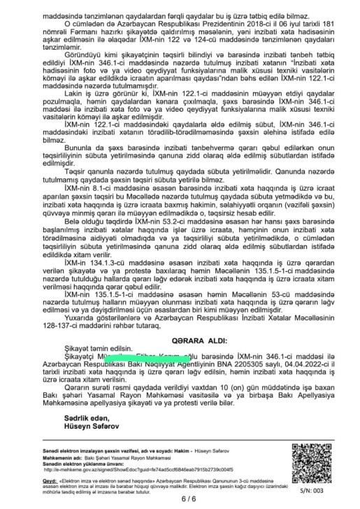 Yasamal rayon Məhkəməsinin hakimi Hüseyn Akif oğlu Səfərovun sədrliyi ilə keçirilən məhkəmədə BNA-nın yazdığı cərimələrin qanunsuz olduğu bildirilib və bu səbəbdən hakim həmin qərara xitam verərək sürücünün şikayətini təmin edib.