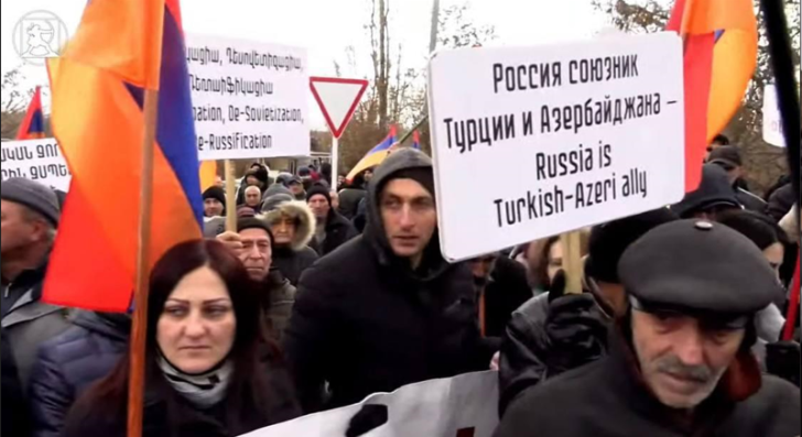 “Report” Ermənistan KİV-ə istinadən xəbər verir ki, etirazçılar “Rusiya Türkiyə və Azərbaycanın müttəfiqidir!”, “Ar olsun belə müttəfiqə!”, “KTMT-yə yox!” və s. şüarlar səsləndiriblər.