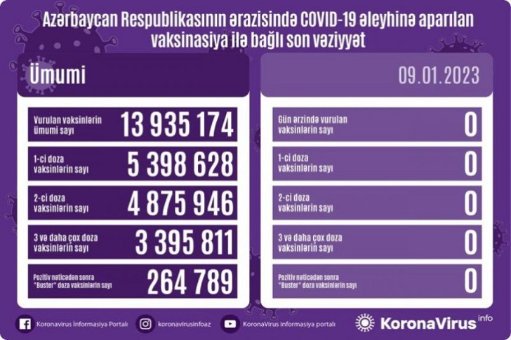 Vurulan vaksinlərin ümumi sayı 13 935 174, birinci mərhələ üzrə vaksinasiya olunanların ümumi sayı 5 398 628, ikinci mərhələ üzrə vaksinasiya olunanların sayı 4 875 946, üç və daha çox doza üzrə vaksinasiya olunanların sayı 3 395 811, pozitiv nəticədən sonra buster doza üzrə vaksinasiya olunanların sayı isə 264 789 nəfər təşkil edir.