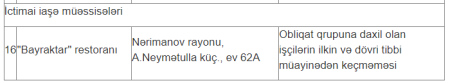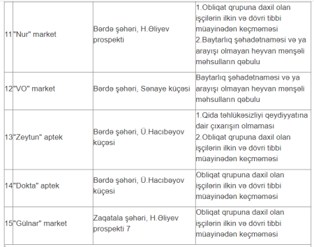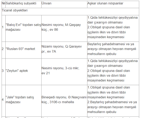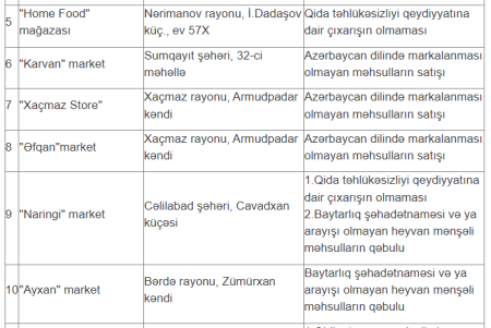 Yoxlama nəticəsində obliqat qrupuna daxil olan işçilərin ilkin və dövri tibbi müayinədən keçirilməməsi, baytarlıq şəhadətnaməsi və ya arayışı olmayan heyvan mənşəli məhsulların qəbulu, Azərbaycan dilində markalanması olmayan məhsulların satışı, qida təhlükəsizliyi qeydiyyatına dair çıxarışın olmaması ilə bağlı nöqsanlar aşkar edilmiş müəssisələr aşağıdakılardır: