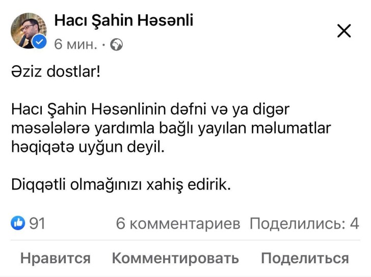 Hacı Şahin Həsənlinin dəfni və ya digər məsələlərə yardımla bağlı yayılan məlumatlar həqiqətə uyğun deyil.