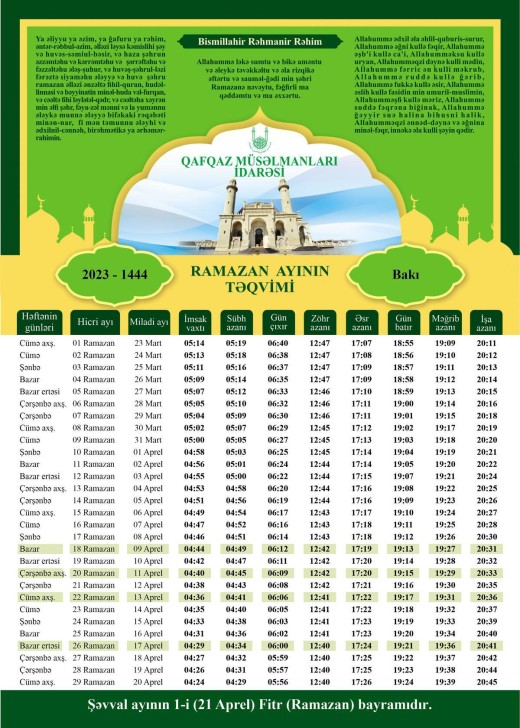 Belə ki, bununla bağlı Qafqaz Müsəlmanları İdarəsi (QMİ) fətva verib. QMİ fətvada bəyan edib ki, İdarənin müvafiq sorğusuna əsasən, Azərbaycan Milli Elmlər Akademiyası Şamaxı Astrofizika Rəsədxanasının 32/201(Ş) saylı 14.12.2022 tarixli cavab məktubuna görə, bu il Ramazan ayının 1-i miladi təqvimlə mart ayının 23-nə təsadüf edir.