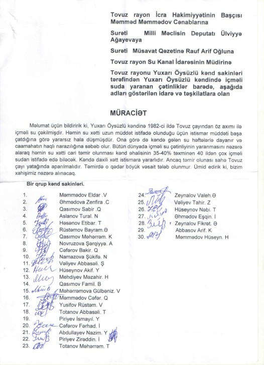 “Buna görə də kəndə gələn su həftələrlə dayanır və camaatın haqlı narazılığına səbəb olur. Bütün dünyada içməli su çətinliyinin yaranmasını nəzərə alaraq, həmin su xəttinin cari təmir olunması kənd əhalisinin 35-40%-i təxminən 40 ildən çox içməli sudan istifadə edə biləcək. Kənddə daxili xətt istismara yararlıdır. Ancaq təmir olunası sahə Tovuz çayı yatağında aparılmalıdır. Təmirə o qədər böyük vəsait tələb olunmur. Ümid edirik ki, xahişimiz nəzərə alınacaq”, - deyə, kənd sakinləri qeyd ediblər.