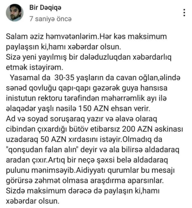 “Qafqazinfo” xəbər verir ki, sosial şəbəkələrdə edilən paylaşımlarda bildirilir ki, Məhərrəm ayı ilə bağlı yaşlı nəslə yardım ediləcəyi adı ilə vətəndaşların pulu mənimsənilir.