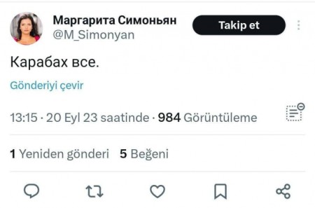 AFN.az xəbər verir ki, bunu erməni əsilli Rusiya jurnalisti və televiziya aparıcısı, Rusiyanın RT kanalının baş redaktoru Marqarita Simonyan "X" sosial platformasında etdiyi paylaşımda bildirib.