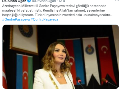 Türkiyədə ATA İttifaqından prezidentliyə keçmiş namizəd Sinan Oğan Qənirə Paşayevanın vəfatı ilə bağlı dərin kədərini ifadə edib.