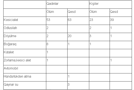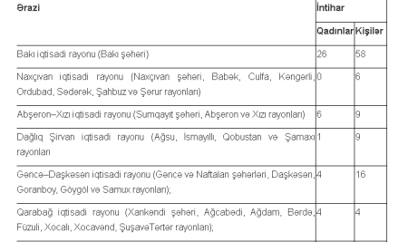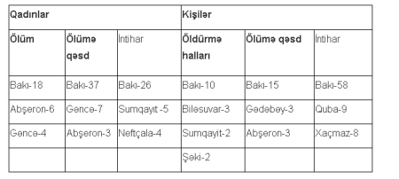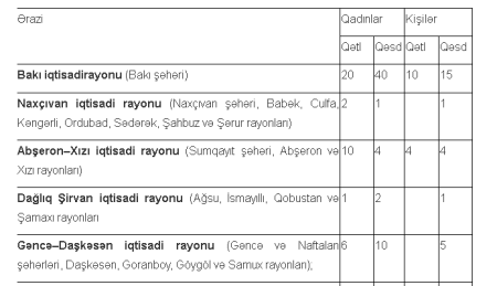 Cədvəldən göründüyü kimi, qadınlarla bağlı qətllər, fiziki zorakılığın ağır forması olan, xəsarətlər, o cümlədən intihatlar daha çox Bakının payına düşür.