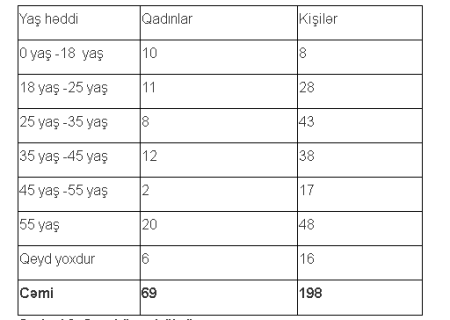 Aparılan təhlil göstərir ki, ən yüksək hədd 35-45 yaşda (6 nəfər) olanlardır. O cümlədən, 18-25 yaş və 55 yaşdan yuxarı olanlar da bu qabildən olanlardır.