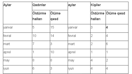 Kişilər arasında qətllərin yüksək həddi may, iyun, iyul aylarına təsadüf edir, ağır bədən xəsarəti alan kişilər, mart, iyun, iyul, avqust, sentybar ayına təsadüf edir.
