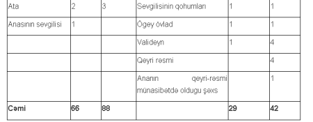 Dördüncü yerdə oğlu (6 hal) və keçmiş həyat yoldaşı (3 hal) qətlə yetirmə faktı müəyyən edilib. Sağlamlığa ağır xəsarətlə oğlu tərəfdən (7 hal), keçmiş həyat yoldaşı tərəfdən isə (6 hal) müəyyən edilib.