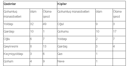 Kişilər arasında məişət zorakılığı zəminində qətllərdə birinci yerdə qohumalar dayanır. Belə ki, 10 qətl, 17 sağlamlığa ağır xəsarət faktları müəyyən edilib.