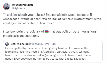 Qeyd edək ki, Peter Mixalko “X” hesabında Azərbaycanda jurnalist həbsləri ilə bağlı paylaşım edib: