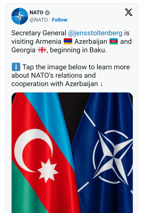 Paylaşımda deyilir ki, NATO Baş katibi Azərbaycandan sonra Gürcüstan və Ermənistana səfər edəcək.