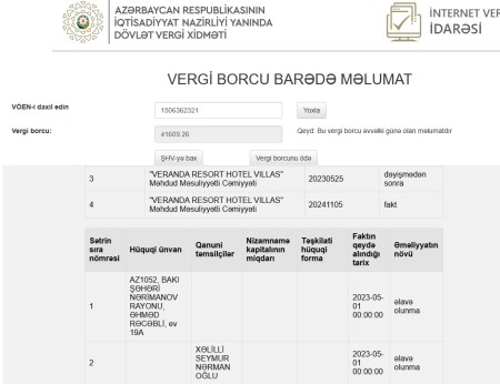 Qeyd edək ki, qanuni təmsilçisi Xəlilli Seymur Nərman oğlu olan "Veranda Resort Hotel Villas" MMC-nin İqtisadiyyat Nazirliyi yanında Dövlət Vergi Xidmətinin Bakı şəhəri Lokal Gəlirlər Baş İdarəsinə 41609.25 manat vergi borcu var. Şirkət Xəzər rayonu Mərdəkan qəsəbəsində "Veranda Hotel"i fəaliyyət göstərir. Şirkətin Bakı şəhərində müxtəlif ünvanlarda restoranlar şəbəkəsi mövcuddur.