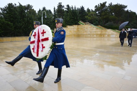 Mixeil Kavelaşvili Azərbaycanın müstəqilliyi və ərazi bütövlüyü uğrunda mübarizədə canlarından keçmiş qəhrəman Vətən övladlarının xatirəsini ehtiramla yad edib, “Əbədi məşəl” abidəsinin önünə əklil qoyub.