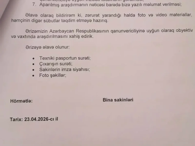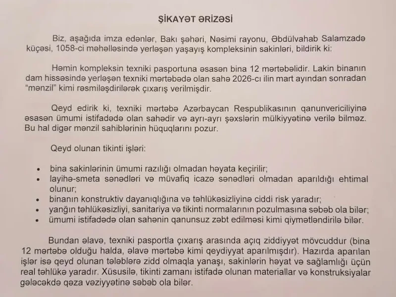 Zamirə Dadaşova müraciətində qeyd edir ki, sakinlərin rəyi və təhlükəsizliyi nəzərə alınmadan aparılan bu tikinti "özbaşnalıq" xarakteri daşıyır.