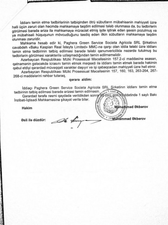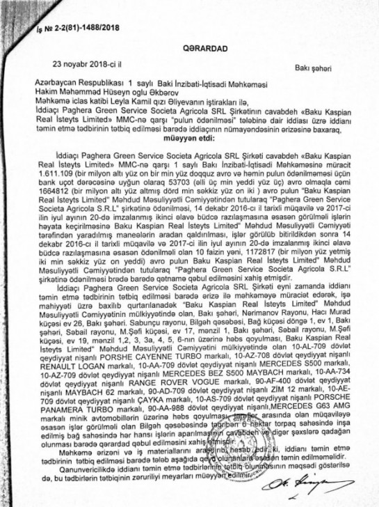 Bu çəkişmə "Baku Caspian Real Estate Limited” şirkətinin sifarişi ilə "Paghera Green Service Societa Agricola SRL” tərəfindən Bakının Bilgəh qəsəbəsində bağ sahəsinin landşaft dizaynı işlərinin yerinə yetirilməsi ilə bağlı yaranıb. Həmin çəkişmə barədə artıq müxtəlif KİV-lər geniş yazıb.
