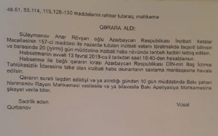 Zərərçəkmiş Ş. 17-ci Polis Bölməsinə şikayət edib və A.Süleymanov barəsində İnzibati Xətalar Məcəlləsinin 157-ci (döymə) maddəsi ilə protokol tərtib olunub. Nərimanov rayon Məhkəməsinin hakimi Vüsal Qurbanov protokol üzrə qərarını elan edib və A.Süleymanov fevralın 13-dən etibarən 20 gün müddətinə inzibati qaydada həbs olunub.