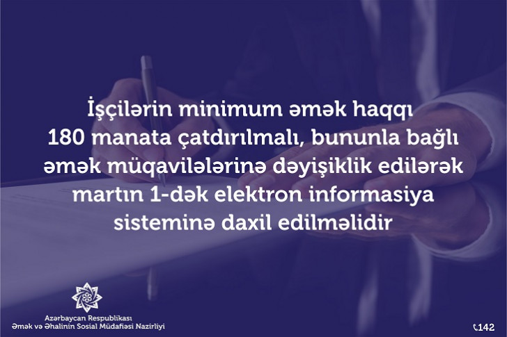 İşçilərin minimum əmək haqqı 180 manata çatdırılmalı, bununla bağlı əmək müqavilələrinə dəyişiklik edilərək martın 1-dək elektron informasiya sisteminə daxil edilməlidir