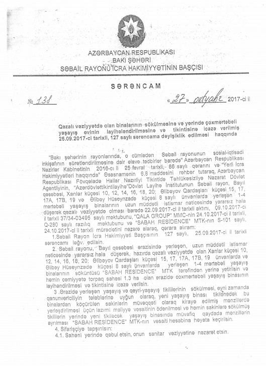Məsələ ilə bağlı "Sabah Rezidence” MTK-ya müraciət etdik. MTK-ya ünvanladığımız məktuba elektron poçt vasitəsilə verilən cavabda bildirilir ki, Azərbaycan Respublikası Nazirlər Kabinetinin "Bakı şəhərinin Suraxanı, Nəsimi, Xətai, Nərimanov, Nizami, Yasamal, Səbail, Pirallahı, Xəzər rayonlarının sosial-iqtisadi inkişafının sürətləndirilməsinə dair əlavə tədbirlər barədə” 25 fevral 2016-cı il tarixli 86 saylı qərarına və Bakı şəhəri Səbail rayon İcra Hakimiyyəti başçısının 25 sentyabr 2017-ci il tarixli, 127 saylı sərəncamı ilə "Qala Group" MMC-yə həvalə edilmişdir. Sonradan Səbail rayon İcra Hakmiyyəti Başçısının 27 oktyabr 2017-ci il tarixli, 138 saylı sərəncamı ilə 25 sentyabr 2017-ci il tarixli, 127 saylı sərəncam ləğv edilmiş və həmin sərəncama əsasən həmin binaların sökülməsi, həmin ərazidə çoxmərtəbəli yaşayış binasının layihələndirilməsi və tikintisinin həyata keçirilməsi "Qala Group" MMC-nin həmtəsisçisi olduğu "Sabah Residence” Mənzil-Tikinti Kooperativinə həvalə edilib.