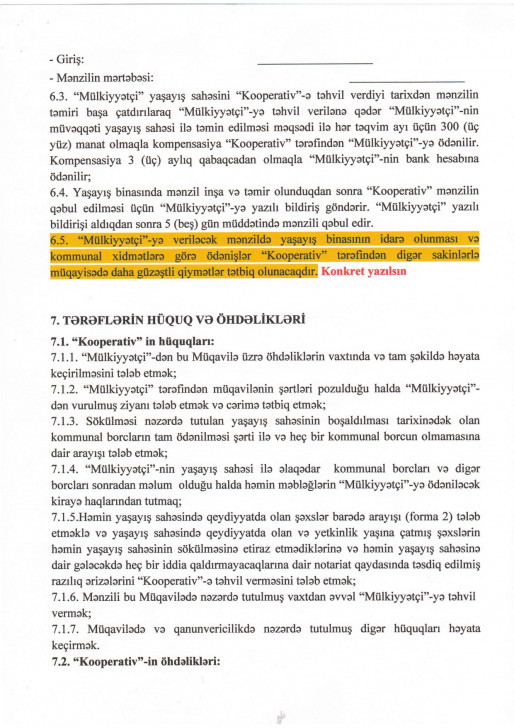 Onlar, həmçinin bildirir ki, MTK ilə bağlanacaq müqaviləyə inanmırlar və müqaviləni imzalayan hüquqi şəsxlər sırasında İcra Hakimiyyətinin olmasını tələb edirlər. "Bizə deyirlər gəlin MTK-ya üzv olun. MTK-ya üzv olmaq nə deməkdir? Əgər mən ora qol çəkirəmsə, mən onlarla "şərik” oluram. Sabah sən burada bina tikə bilmədin, iflasa uğradın mən səni məhkəməyə verə bilməyəcəm. Çünki mən öz xoşluğumla MTK-ya daxil olmuşam. Biz bununla razılaşa bilmirik. Biz deyirik ki, pul ver. Biz tikdiyin binada yaşamaq istəmirik. Onlar da deyir bizə sərf eləmir”, - deyə şikayətçilər söyləyirlər.