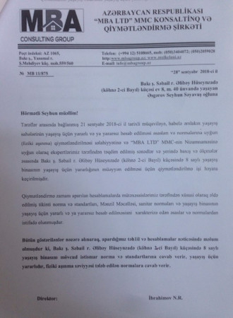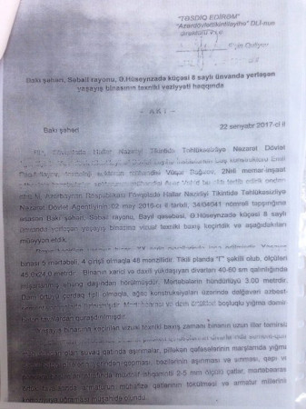 Şikayətçilər deyirlər ki, yaşadıqları binanın yararsız vəziyyətdə olması barədə Azərtikintilayihə Dövlət Layihə İnstitutunun aktı da saxtadır. Belə ki, sakinlər binalarına texniki baxış keçirmək üçün öz vəsaitləri hesabına özəl ixtisaslaşmış "MBA Consulting Group” şirkətinə müraciət edib. Şirkətin gəldiyi rəydə bildirilir ki, Bakı şəhəri Səbail rayonu ,Əli bəy Hüseynzadə, 8 ünvanında yerləşən çoxmənzilli yaşayış binasının orta fiziki aşınma göstəricisi 35,66 faiz təşkil edir. Qüvvədə olan normalara görə isə yaşayış binasının fiziki aşınma dərəcəsi 70 faiz və daha yuxarı olduqda bina yaşayış üçün yararsız sayılır.