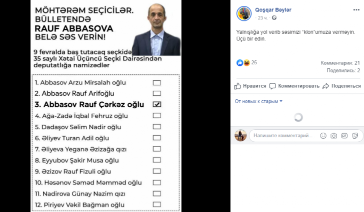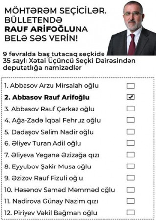 Fevralın 2-də “Yeni Müsavat” qəzetinin təsisçisi, 35 saylı Xətai 3-cü seçki dairəsindən deputatlığa namizəd Rauf Arifoğlu Facebook-da özünün seçki afişasını yerləşdirib. Afişa seçki bülletenindən ibarətdir və orada seciçilərin çaşmaması üçün namizədlər arasında 2-ci sırada olan Rauf Arif oğlu Abbasovun adının qarşısında “quş” (işarə) qoyulub. Di gəl, heç iki gün keçməmiş Facebook-da bir növ “klon-plakat” peyda olub. Eyni ideya, eyni şrift, hətta “klon”a səs verməməyə çağırış. Ancaq plakat müəllifləri seçiciləri “quş”u üçüncü sətirdə qoymağa səsləyirlər. Və bütün bunlar səsləri Rauf Abbasova, yəni Rauf Çərkəz oğlu Abbasova vermək çağırışı ilə müşayiət olunur.