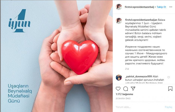 Azərbaycanın Birinci vitse-prezidenti Mehriban Əliyeva rəsmi “Instagram” səhifəsində 1 İyun - Uşaqların Beynəlxalq Müdafiəsi günü ilə bağlı paylaşım edib.
