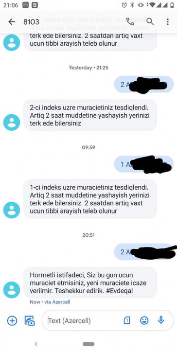 Son bir neçə gün ərzində sosial şəbəkələrdə "SMS icazə”dən gün ərzində iki koddan yalnız birindən istifadə etməyə icazə verildiyi bildirilir. Vətəndaşlar qeyd ediblər ki, artıq həkimə getmək üçün icazə aldıqdan sonra 2 kodu üzrə marketə getməyə icazə üçün müraciət etdikdə, onlara imtina qərarı göndərilib.